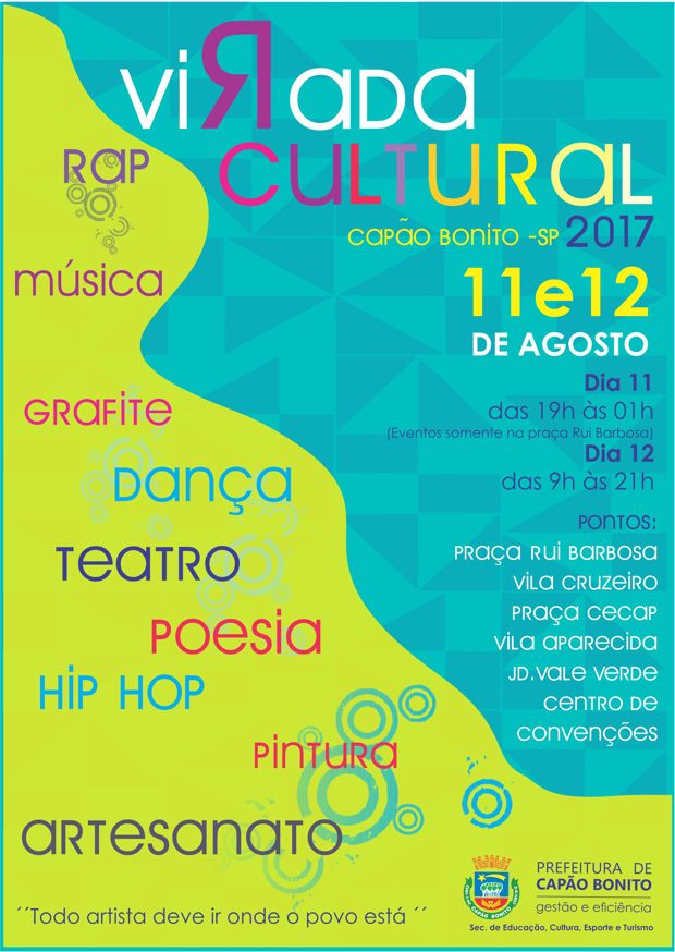 A VIRADA CULTURAL DE CAPÃO BONITO 2017, promoção da Secretaria de Educação, Cultura Esporte e Turismo de Capão Bonito através da Lei no 4227 de 25 de outubro de 2016 , acontecerá no período de 11 a 12 de Agosto de 2017, em diversos pontos da cidade, tendo como Ponto Matriz a Praça Rui Barbosa.