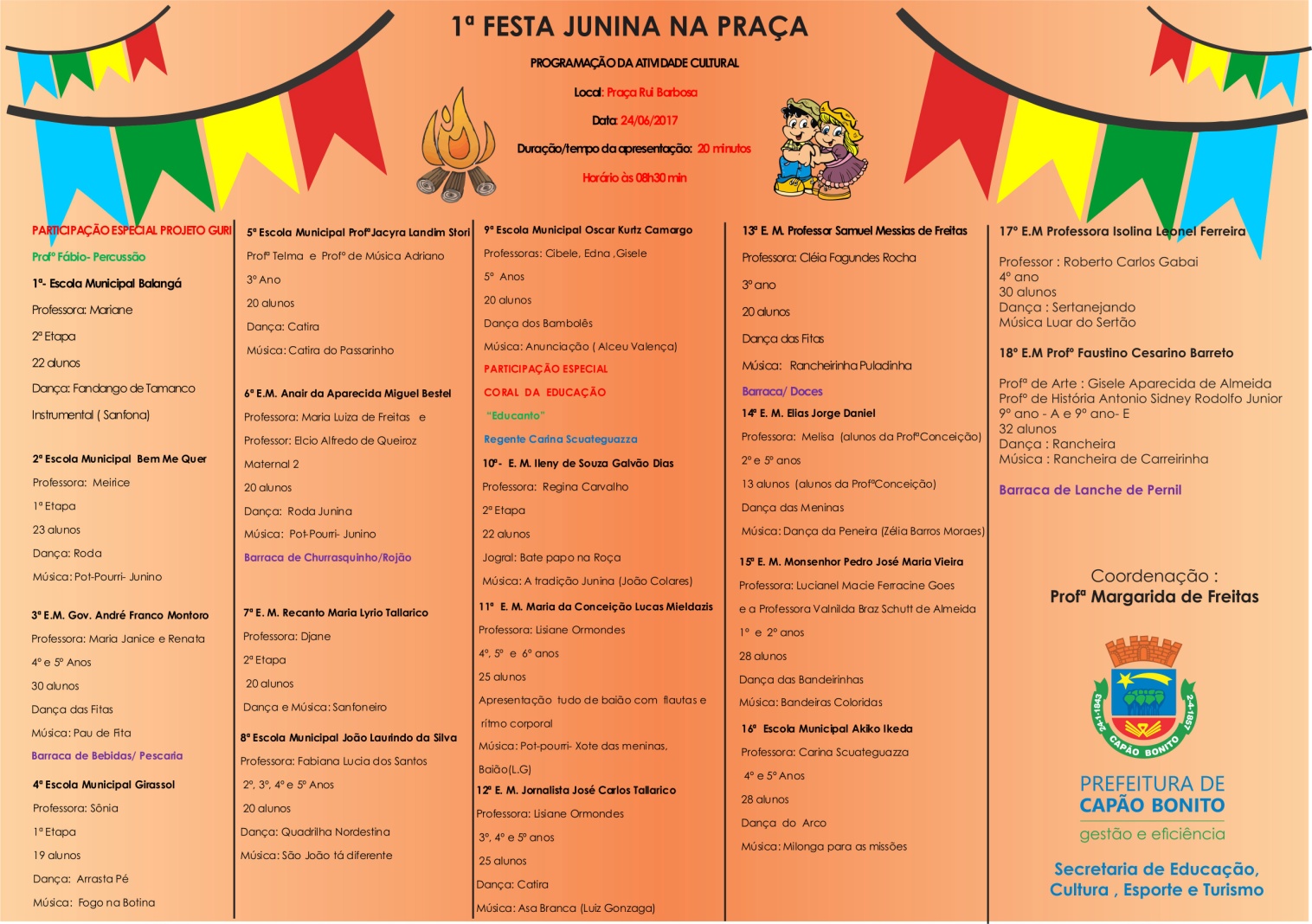 Acontece neste sábado, 24/06, na Praça Rui Barbosa – a 1ª Edição da Festa Junina das Escolas Municipais, com início as 8:30 horas.