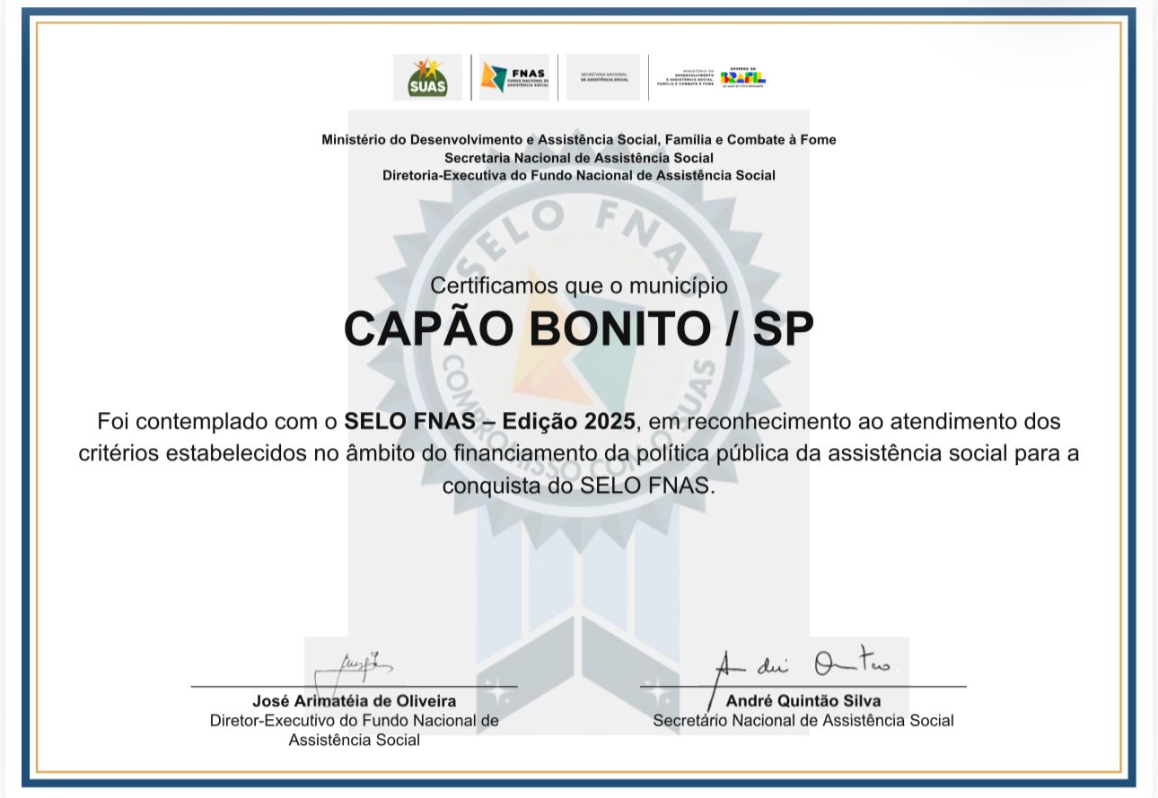 RECONHECIMENTO DE GESTÃO | O município de Capão Bonito foi contemplado com o Selo do Fundo Nacional de Assistência Social (FNAS), um importante reconhecimento concedido pelo Governo Federal a estados e municípios que se destacam na gestão dos recursos da Assistência Social.