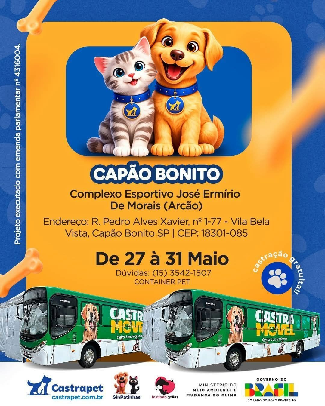 CASTRAMOVEL | A Prefeitura de Capão Bonito anunciou mais uma importante ação voltada ao bem-estar animal: o Programa Castramóvel, que oferecerá castração gratuita para toda a cidade, ampliando o acesso da população ao serviço e fortalecendo as políticas públicas de saúde animal.