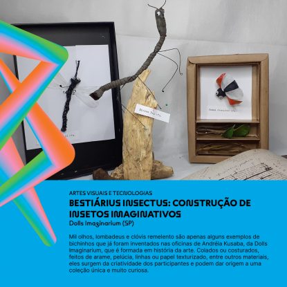 Mil olhos, lombadeus e clóvis remelento são apenas alguns exemplos de bichinhos que já foram inventados nas oficinas de Andréia Kusaba, da Dolls Imaginarium, que é formada em história da arte. No Circuito Sesc ela ministra a atividade Bestiárius insectus: construção de insetos imaginativos. Colados ou costurados, feitos de arame, pelúcia, linhas ou papel texturizado, entre outros materiais, eles surgem da criatividade dos participantes e podem dar origem a uma coleção única e muito curiosa.