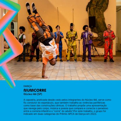 A capoeira, praticada desde cedo pelos integrantes do Núcleo Iêê, serve como fio condutor do espetáculo NumCorre, que também engloba as vivências periféricas como base das construções cênicas. O trabalho propõe uma apresentação que navega pelo corpo, música e poesia que compara e conecta o paradoxo entre a correria infantil e o “corre” do adulto”. Por este trabalho, o grupo foi indicado em duas categorias do Prêmio APCA de Dança em 2023.