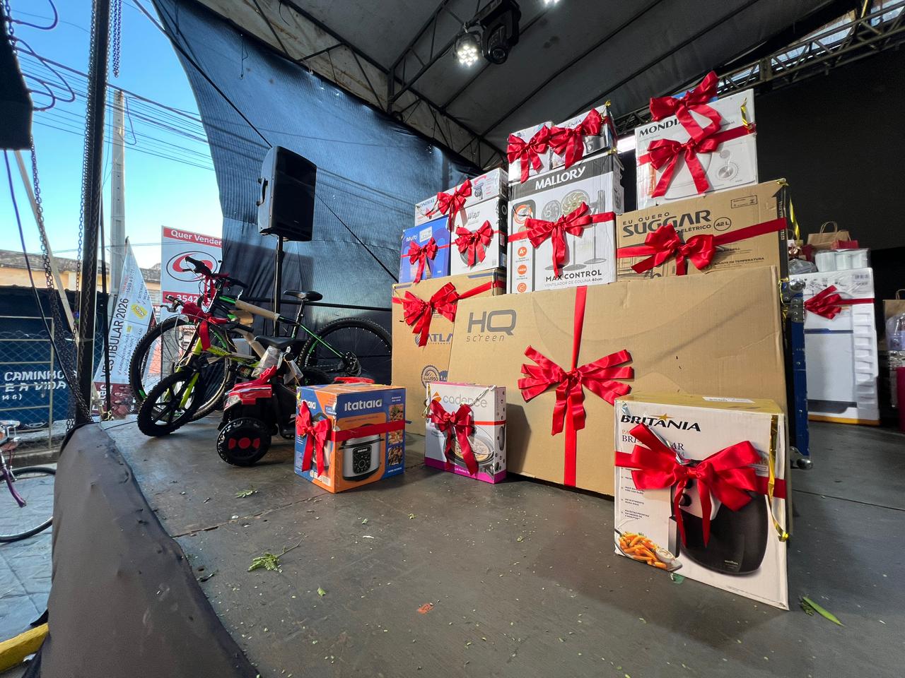 O sorteio da motocicleta 0 km foi um dos momentos mais aguardados pelo público, mas os contribuintes também concorreram a geladeira, fogão, televisão, micro-ondas, notebook e diversos eletrodomésticos. Um volume recorde de brindes foi distribuído, animando os participantes que acompanharam a programação na praça.