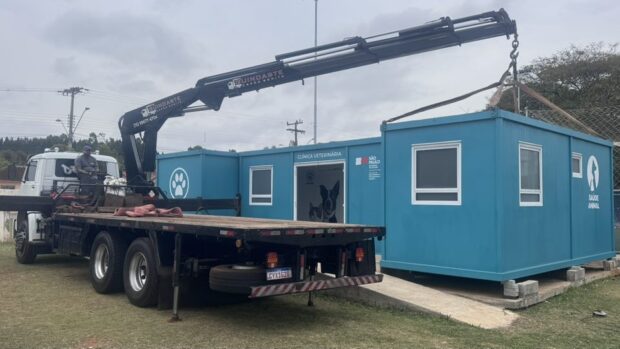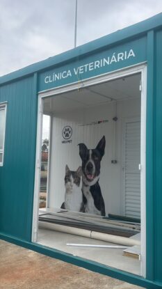 O modelo conta com quatro contêineres interligados, totalmente equipados para consultas, exames e análises clínicas, garantindo condições adequadas para o cuidado com cães e gatos.