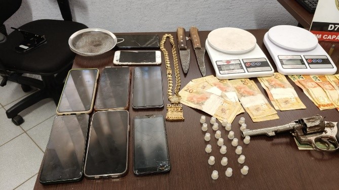 Também foram apreendidas duas balanças de precisão, peneiras utilizadas no refino das substâncias ilícitas e duas facas empregadas no preparo e divisão das drogas.