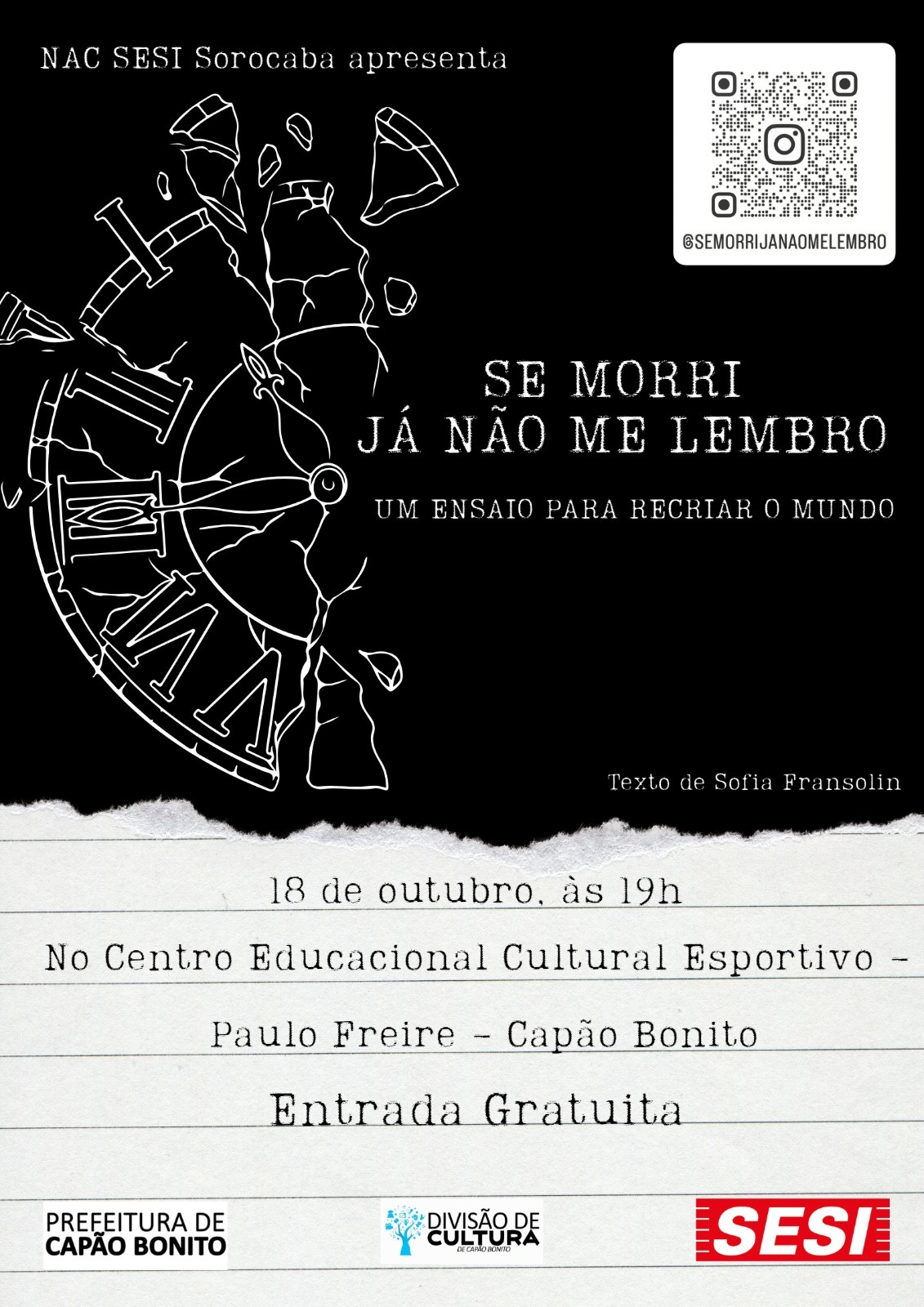 TEATRO GRATUITO EM CAPÃO BONITO | Capão Bonito recebe no próximo dia 18 de outubro, às 19h, no Centro Educacional e Cultural Paulo Freire (antigo Capão Bonito Clube), a apresentação da peça “Se morri já não me lembro: um ensaio para recriar o mundo”, criada a partir da dramaturgia de Sofia Fransolin e encenada pelos alunos do módulo Encenação 2025 do Núcleo de Artes Cênicas (NAC) do Sesi Sorocaba.