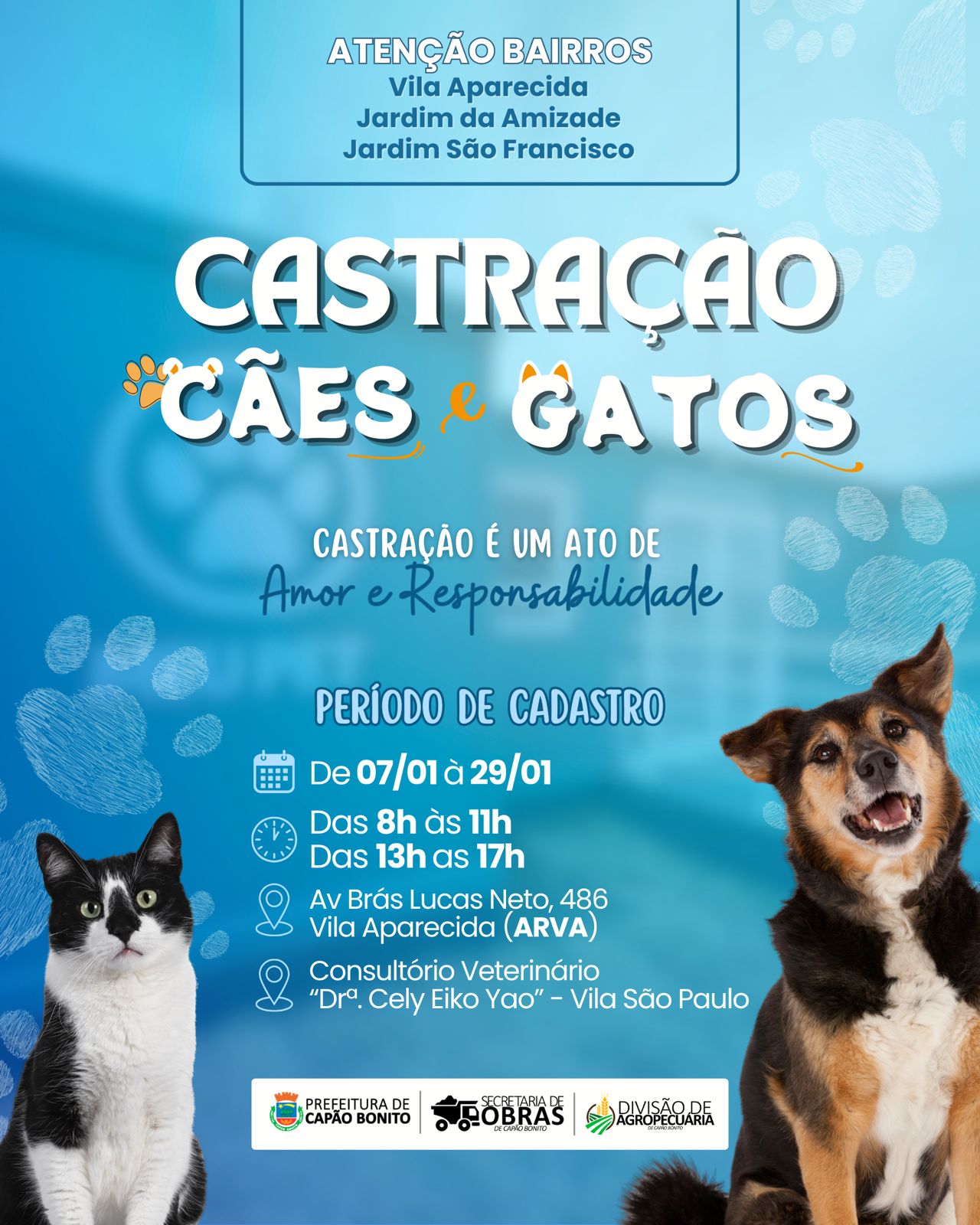 CIDADE AMIGA DOS ANIMAIS | Os tutores de cães e gatos de Capão Bonito já podem se organizar: o cadastro para o Programa de Castração 2026 foi reaberto e poderá ser realizado até o dia 29 de janeiro. A iniciativa integra as políticas públicas voltadas ao bem-estar animal e ao controle responsável da população de pets no município.