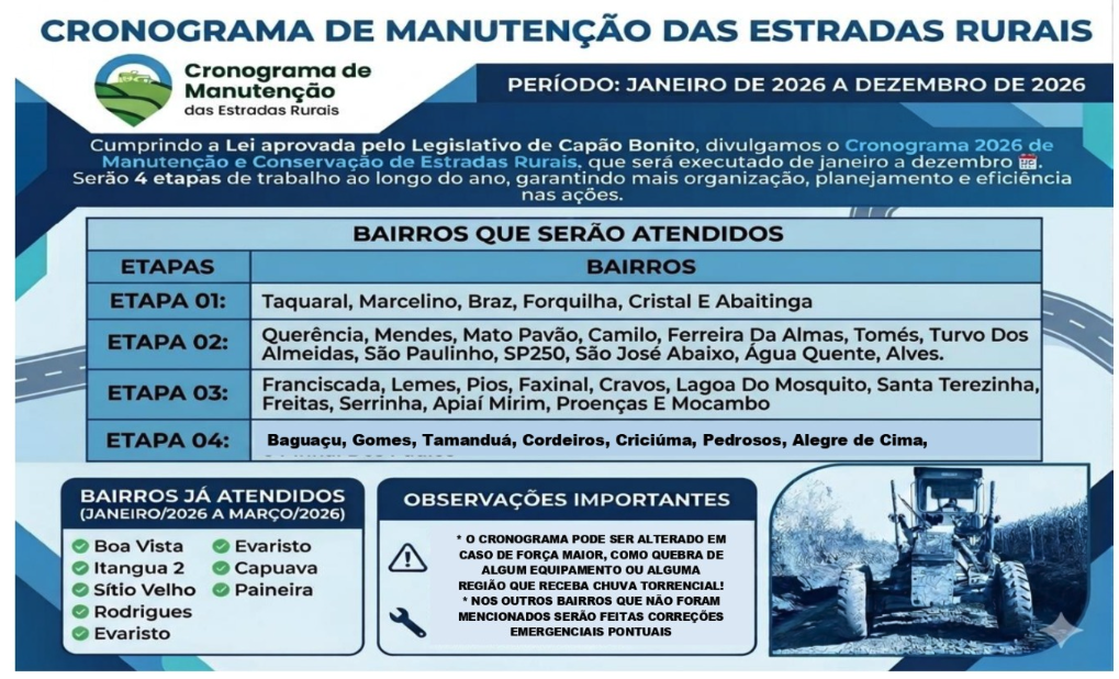 CRONOGRAMA 2026 | A Prefeitura de Capão Bonito apresentou o cronograma de manutenção das estradas rurais para o ano de 2026, com o objetivo de garantir melhores condições de tráfego, segurança e mobilidade para moradores, produtores rurais e usuários das vias do município.