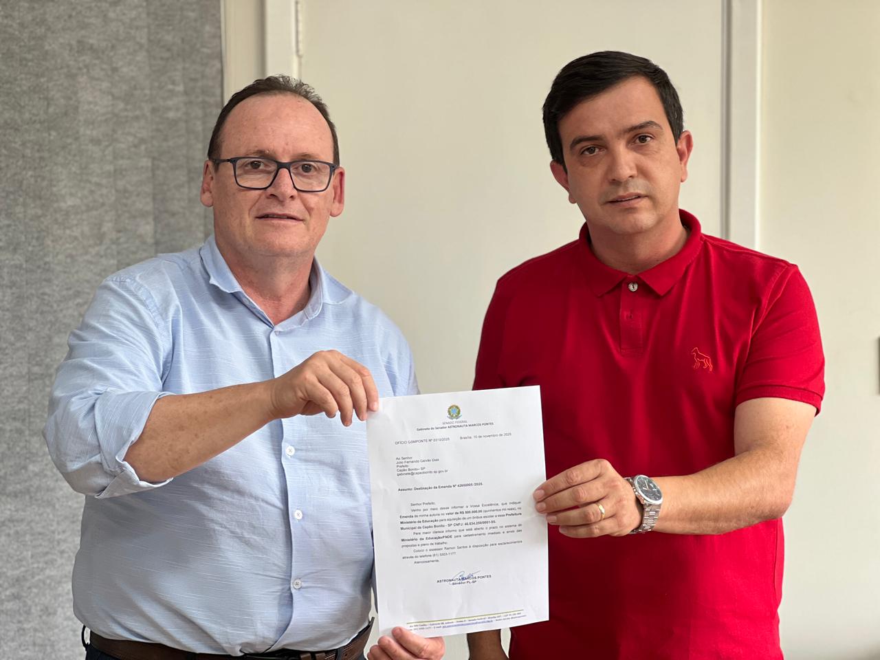 MAIS RECURSOS CHEGANDO | O prefeito Júlio Fernando recebeu, na tarde de segunda-feira, 17 de novembro, o presidente da Câmara Municipal – Alan Senciatti, que apresentou uma excelente notícia para a educação de Capão Bonito: o senador Astronauta Marcos Pontes (PL) destinou uma emenda parlamentar de R$ 500 mil para a aquisição de um novo ônibus escolar para o município.