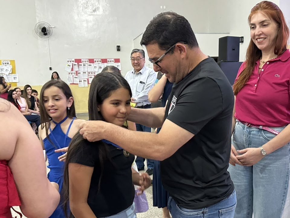 A cerimônia contou com a presença do prefeito Julio Fernando, do vice-prefeito Roberto Tamura, do secretário de Educação Lucas Barros e do vereador Nino Nunes, além da equipe da Secretaria Municipal de Educação – diretora Sandra Camargo, Karina, Andreia, Ricardo e Magali –, que fizeram questão de prestigiar e parabenizar os jovens autores.