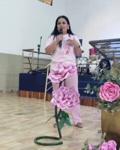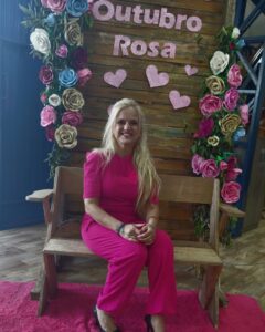 Um dos momentos mais emocionantes da tarde foi o depoimento inspirador de uma convidada especial, que compartilhou sua história de superação, fé e esperança, mostrando que o amor e o autocuidado são forças poderosas na luta contra o câncer.